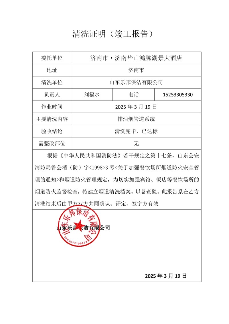 濟南市·濟南華山鴻騰湖景大酒店清洗報告25.3.19