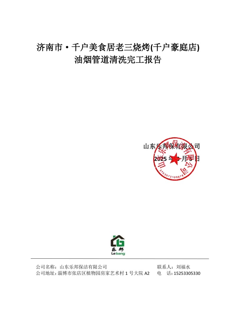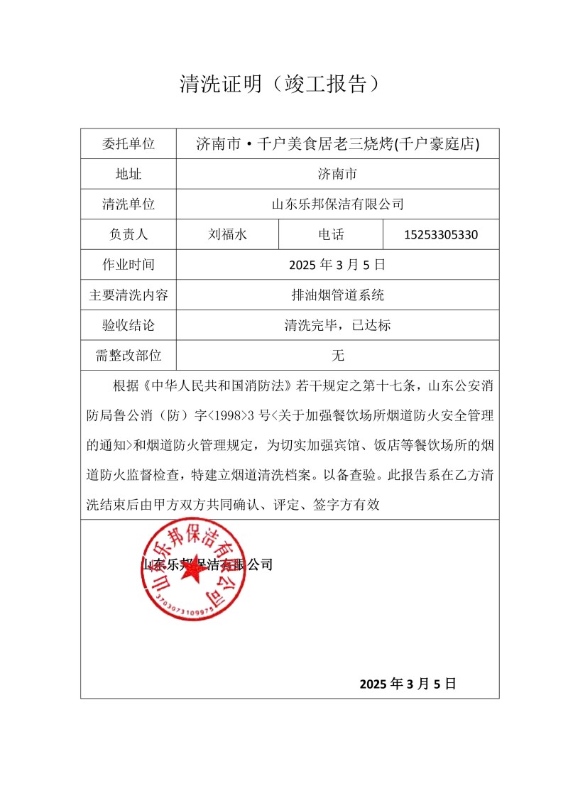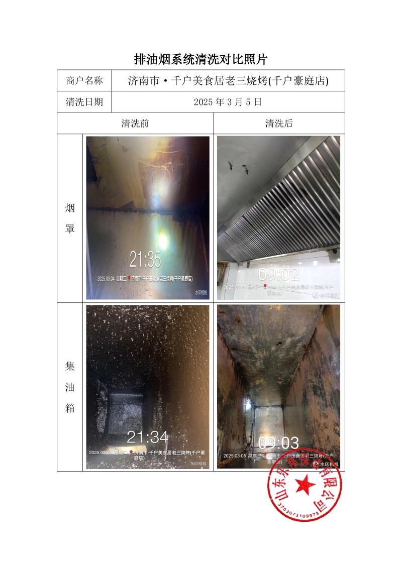 濟(jì)南市·千戶美食居老三燒烤(千戶豪庭店)清洗報(bào)告25.3.6