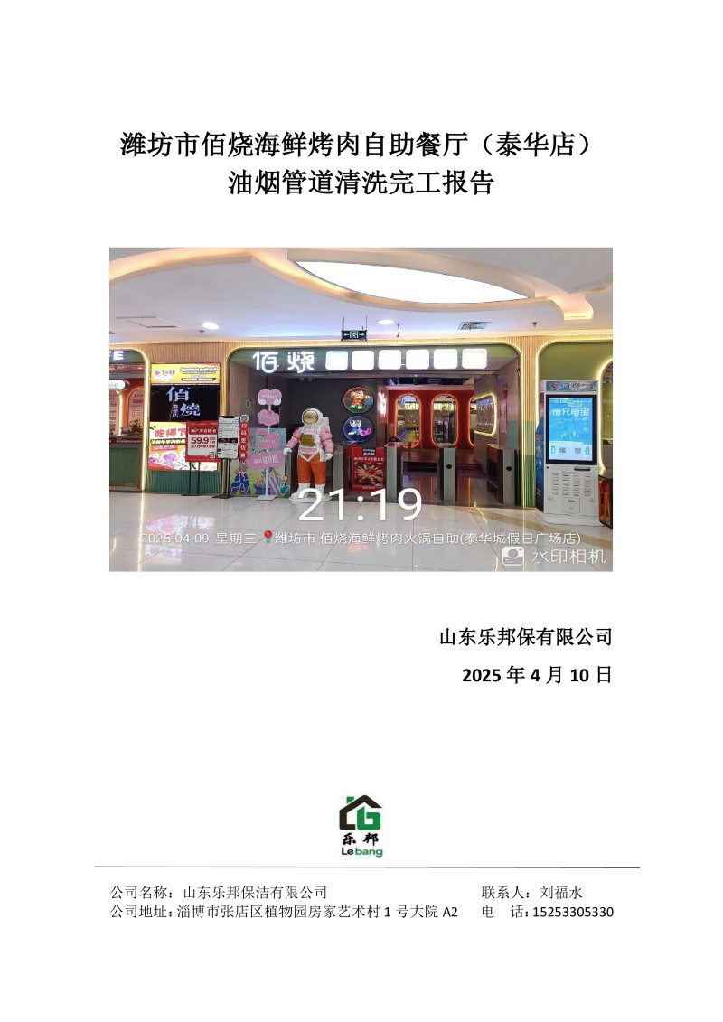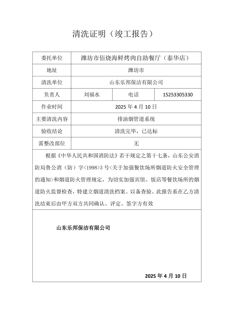 濰坊市佰燒海鮮烤肉自助餐廳(泰華店)清洗報(bào)告25.4.10