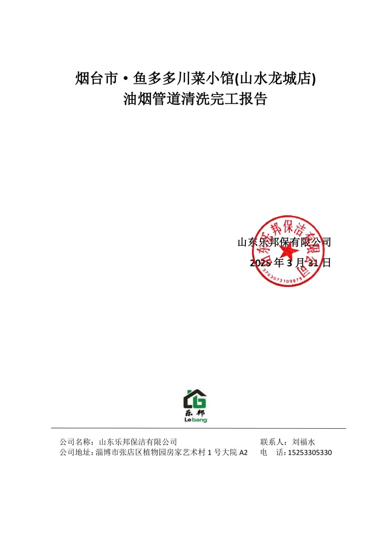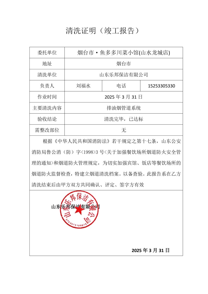 煙臺市·魚多多川菜小館(山水龍城店)清洗報告25.3.31