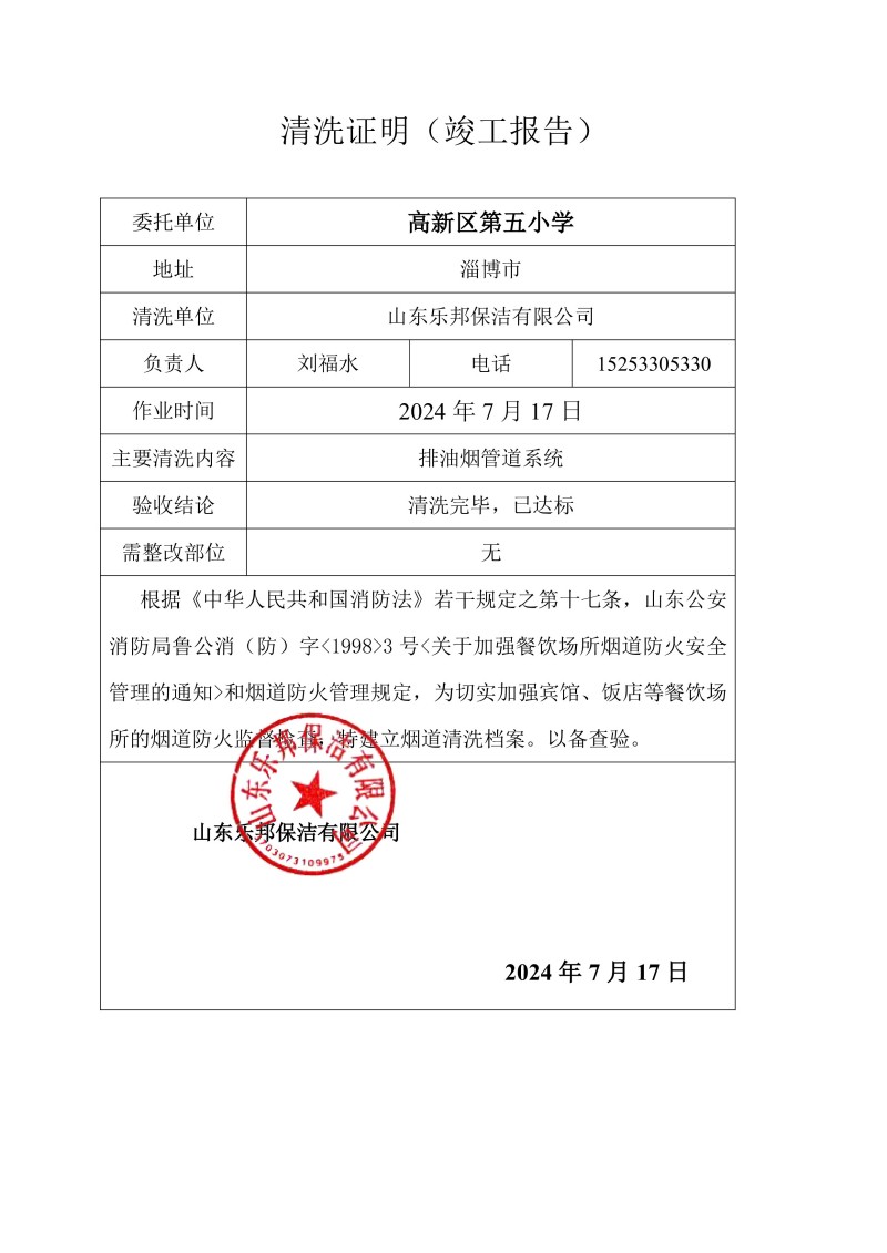 高新區(qū)第五小學清洗報告24.7.17