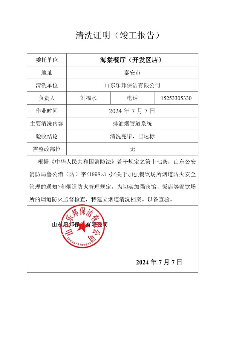 海棠餐廳(開發(fā)區(qū)店)清洗報(bào)告24.7.7