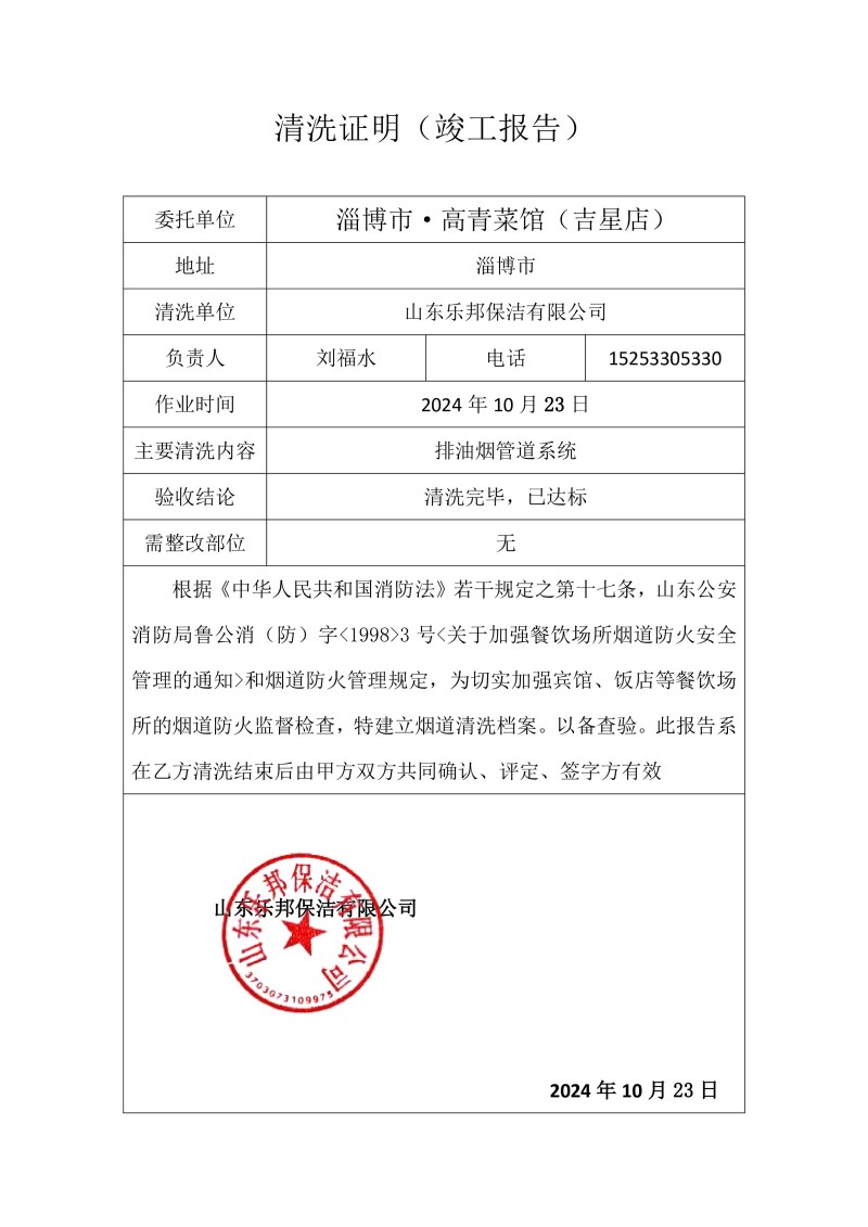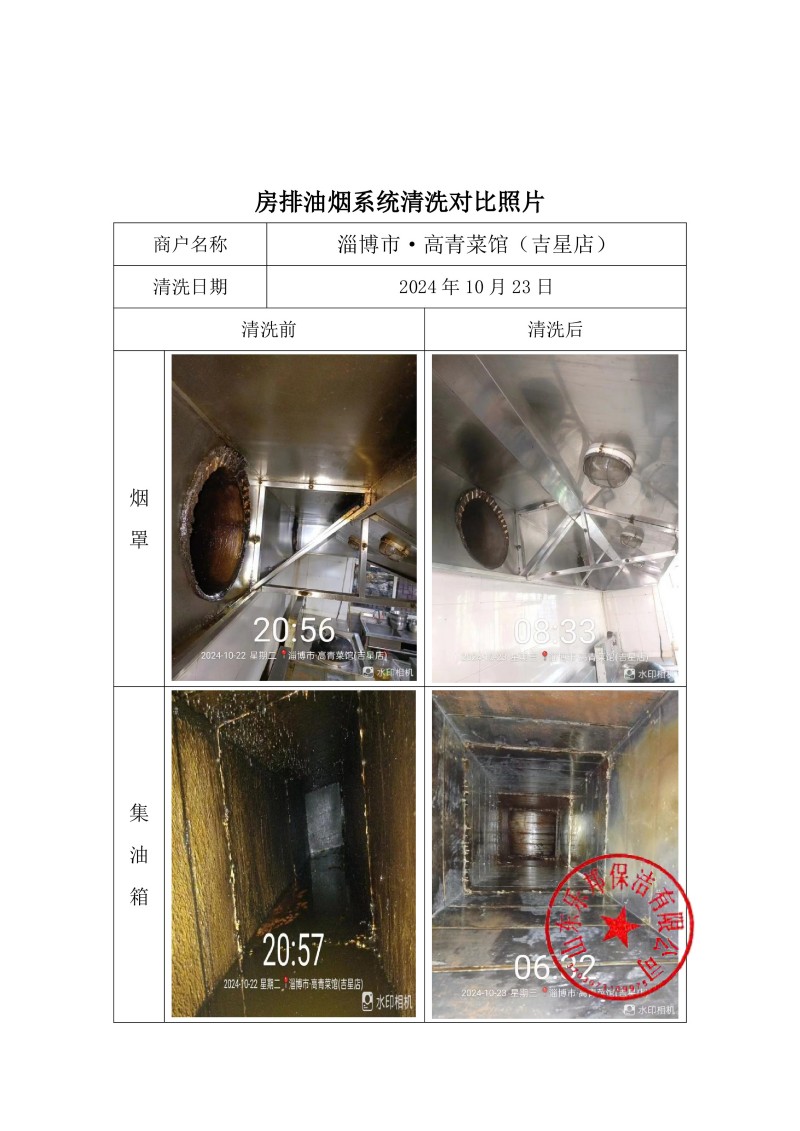 淄博市·高青菜館(吉星店)清洗報(bào)告24.10.23