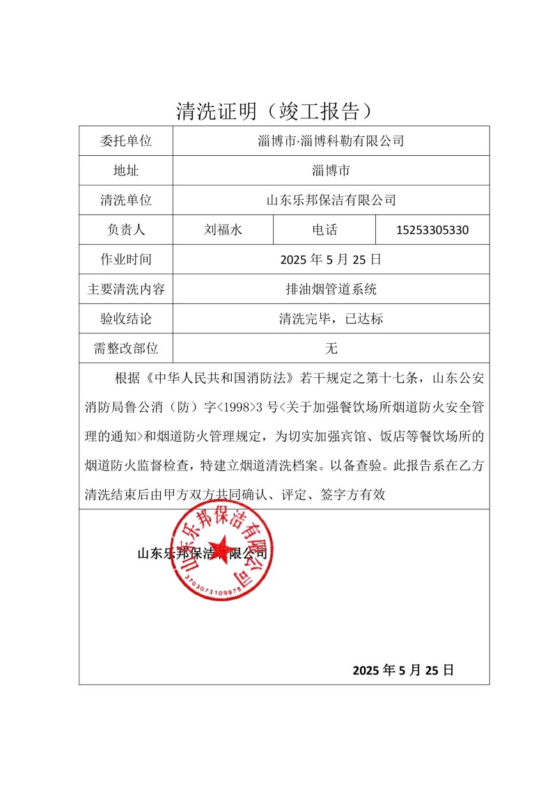 淄博市·淄博科勒有限公司清洗報(bào)告25.5.25